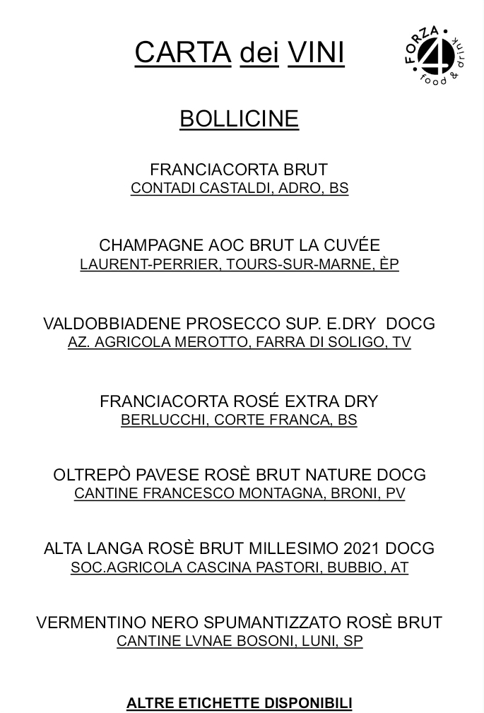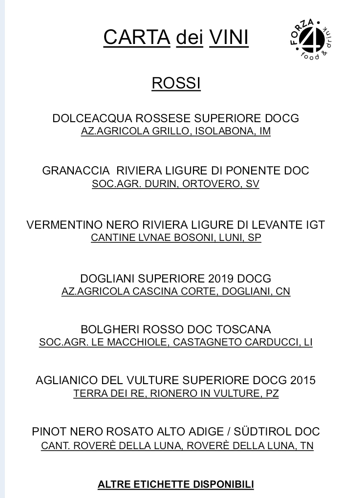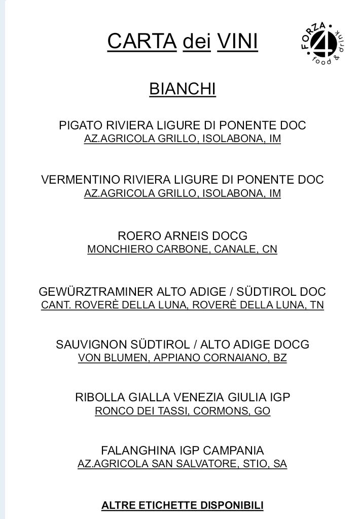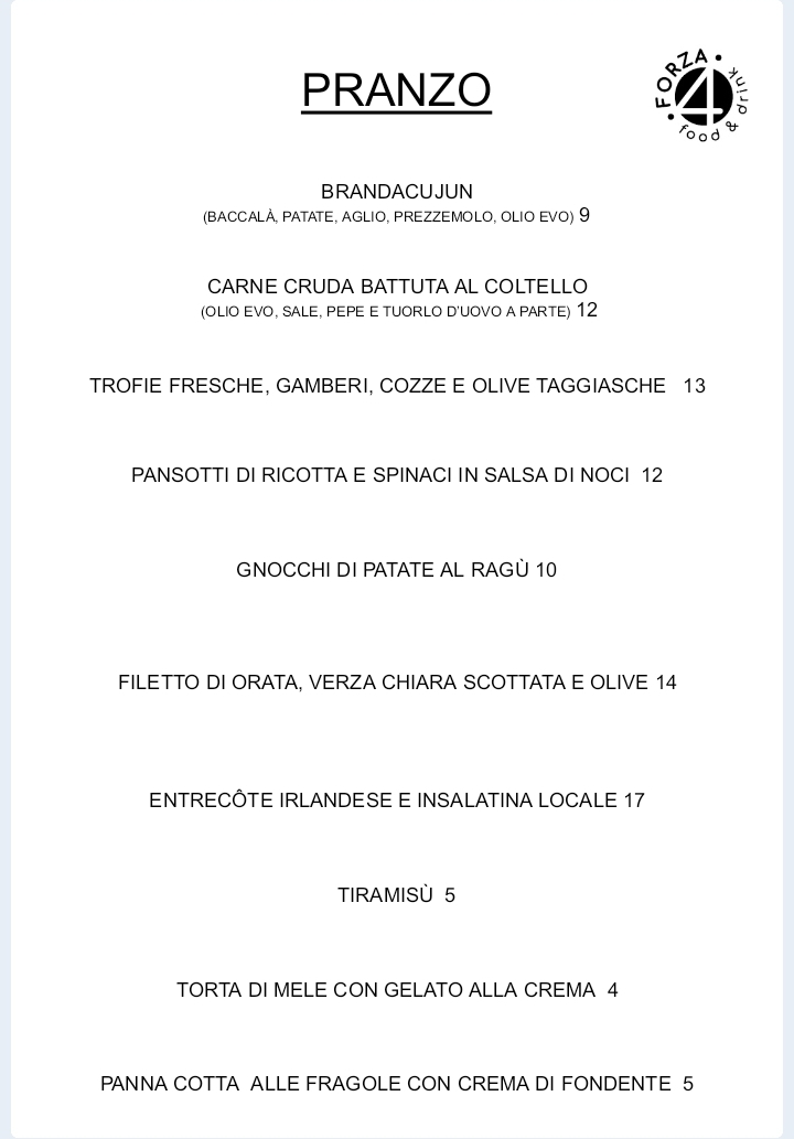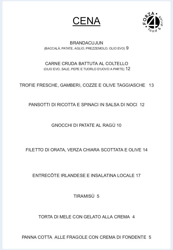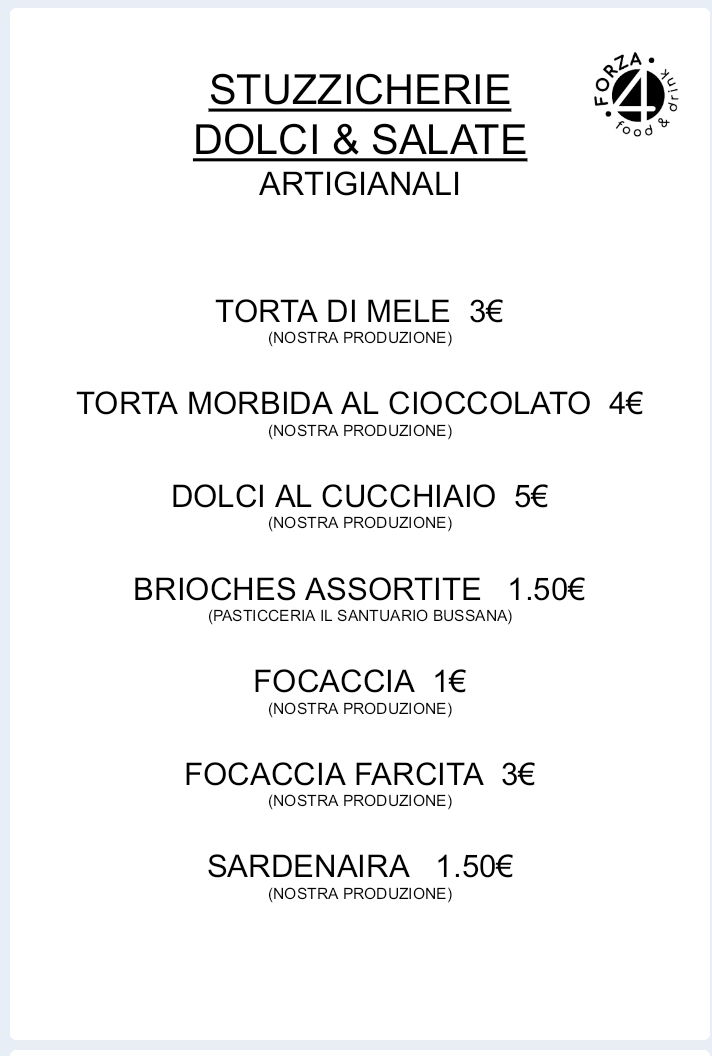 The menu at Forza 4 offers a delightful blend of traditional Italian flavors and inventive dishes that showcase the best of local ingredients. A standout starter is the Totani E Gamberi, a seafood dish that expertly combines squid and shrimp, creating a fresh, light beginning to the meal. For pasta lovers, the Lasagne Al Ragù is a must-try, with its rich and comforting meat sauce layered between delicate sheets of pasta. If you're looking for something more unique, the Gnocchi Con Tartare Di Palamita provides a refreshing twist, combining soft, pillowy gnocchi with the delicate flavors of raw palamita tuna. The Tagliere Di Salumi E Formaggi is perfect for sharing, offering a selection of cured meats and cheeses that are both varied and satisfying. For dessert, the Cheesecake Con Cioccolato offers a creamy, decadent finish to the meal, while a classic Caffè Macchiato serves as the perfect pick-me-up to round off the experience. The menu at Forza 4 is thoughtfully crafted, offering both hearty and refined options to suit every palate.